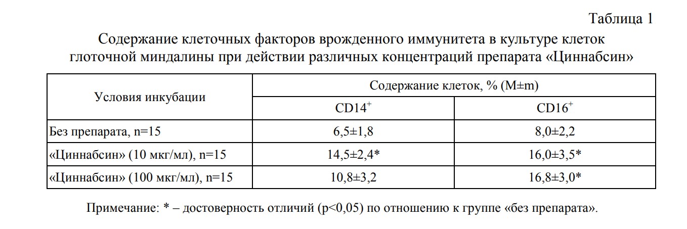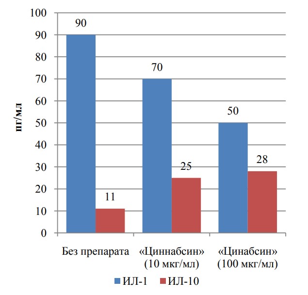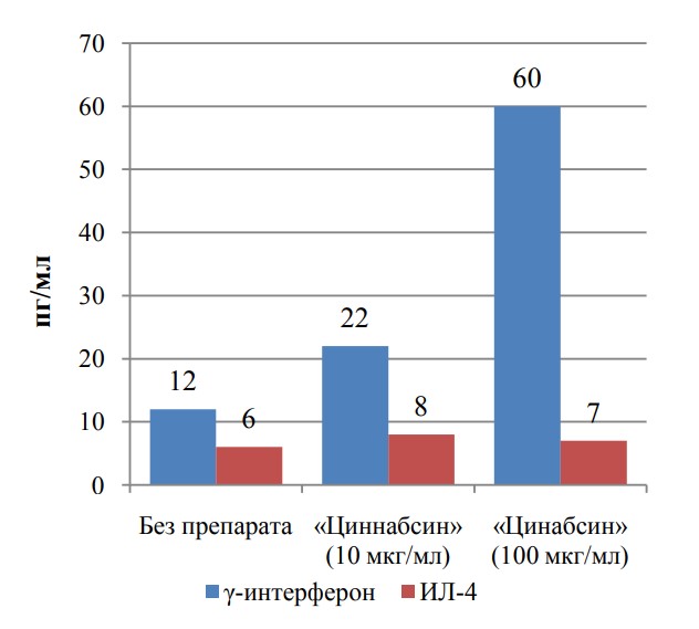 В условиях in vitro исследовано действие препарата «Циннабсин» в разведениях 10-100 мкг/пробу на спонтанную продукцию провоспалительных (интерлейкин1β, Ил-1) и противовоспалительных (Ил-10) цитокинов. Исследовалось также содержание регуляторного и антивирусного фактора – γ-интерферона (γ-ИФ), его антагониста – интерлейкина-4 (Ил-4). Применялись наборы реактивов производства ООО «Цитокин» (Россия) и иммуноферментный анализатор Stat FAX-2100 (США). Кроме того, в культуре клеток после инкубации с препаратом определялись изменения в составе клеток при действии препарата на экспрессию поверхностных лейкоцитарных антигенов по кластерам дифференциации клеток (CD): CD16+ , CD14+ , фенотипически отражающих представительство клеточных факторов врожденного иммунитета [2]. Применялся розеточный метод [6] с использованием консервированных эритроцитов, «нагруженных» соответствующими моноклональными антителами, и оптический микроскоп Olympus-С321 (Япония).