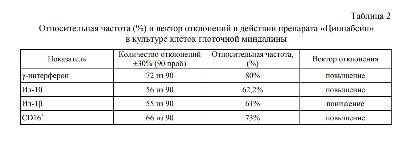 Если сопоставить вектор и количество отклонений (±30% от среднего значения каждого показателя) в поставленных 90 пробах культур клеток (табл. 2.), то можно считать доказанным, что комплексный натуральный препарат «Циннабсин» является активным иммуномодулирующим средством и, по крайней мере, весомая часть его клинической эффективности обусловлена иммунологическими и противовоспалительными механизмами. Таким образом, авторами в культуре клеток глоточных миндалин детей исследовано влияние комплексного натурального препарата Циннабсин на продукцию клетками различных групп цитокинов (γинтерферон, интерлейкины 1, 4, 10), экспрессию поверхностных антигенов лейкоцитов – CD14+ , CD16+ , а также цитолитическую активность естественных киллеров. По сумме влияний и векторам иммуномодуляции можно констатировать модулирующее влияние препарата на активность различных реакций иммунитета, что позволяет сделать вывод о выраженном противовоспалительном и противовирусном действии препарата Циннабсин.